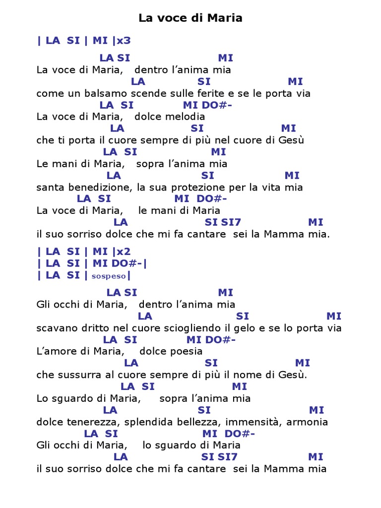 La scelta di maria testo e accordi. La voce di Maria LA SI MI x3 LA SI MI La voce di Maria dentro lanima mia LA SI MI come un balsamo scende sulle ferite e se le porta via LA SI MI DO-La voce di Maria dolce melodia LA SI MI che ti porta il cuore sempre di più nel cuore di Gesù LA SI MI Le. Tutti gli Accordi sono 100 corretti garantiti dai Maestri musicisti di Accordi e Spartiti.